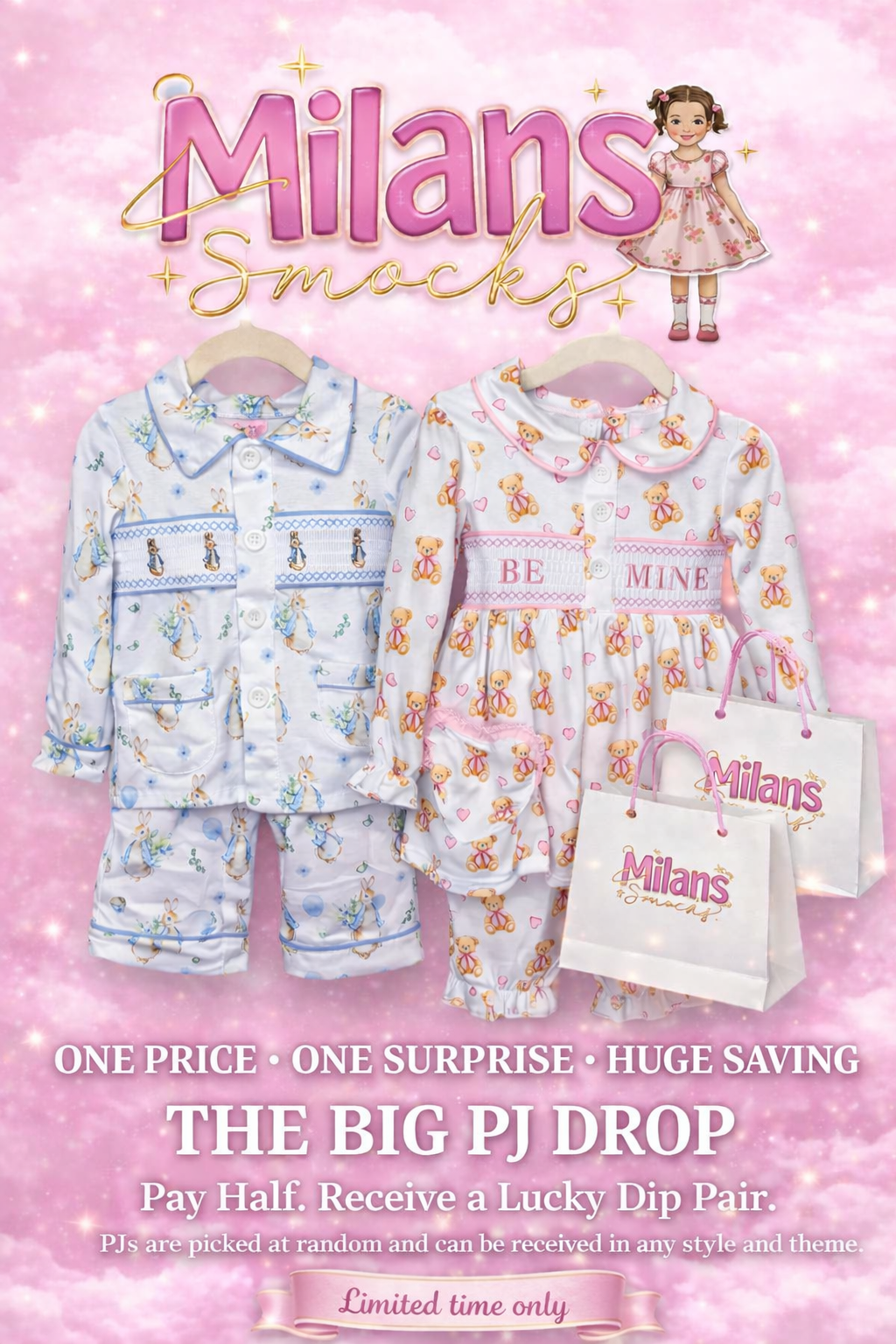 pay 50% for smocked Pyjamas and recieve a pair randomly selected by us.